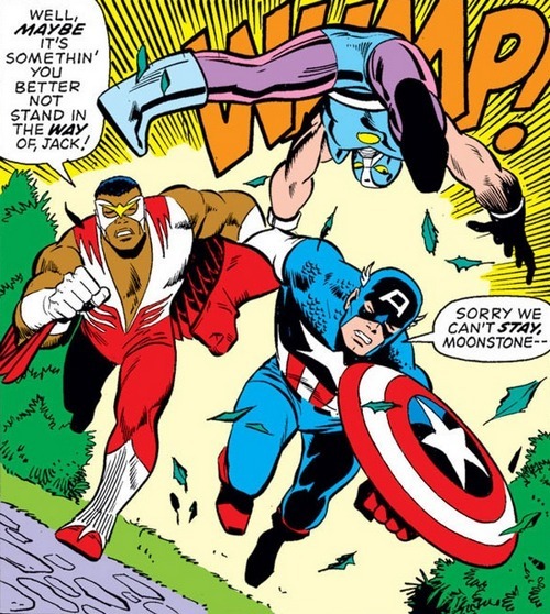 Не мешкая, летим в комикс Captain America #172. Лунный Камень злорадствует – Капитан Америка и Сокол повержены! Хардерман не разрешает героев добить – тогда они в глазах общественности станут благими мучениками, а не злостными преступниками. Ну, Лунный Камень приказывает прихвостням стеречь героев, а сам отправляется звонить в дружественные газеты, чтобы собирать народ. А прихвостни треплются. Воспользовавшись их отвлечением, пришедший в себя Кэп вскакивает и устраивает раздачу зипдюлей, да и Сокол вскоре присоединяется к веселью. После этого герои сбегают, практически протоптавшись по Лунному Камню. Он начинает психовать – вот-вот репортёры прибудут, а показать им побитых и пойманных Кэпа и Сокола он уже не может. А герои, сняв маски и накинув пальто, отправляются на попутках в Нэшвиль – городок, где также расположен музей, в котором был выставлен давший силу Лунному Камню лунный камень.