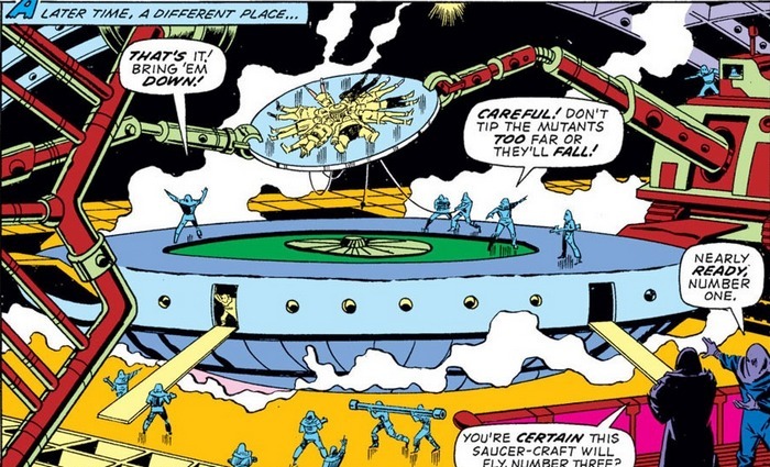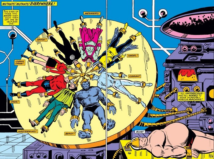 В попытках не погибнуть Кэп и Сокол носятся по базе Империи и сталкиваются с мощным роботом (см. обложку). Робот силён, и толком противостоять ему может только Кэп. Всё же комбинация ловкости и меткости позволяет ударить по уязвимому месту робота и уничтожить его. А вскоре и Профессор с Джин и Циклопом прибывает, и заодно сообщает, что у Сокола “паранормальный мозг” и Редвинг (ручной сокол Сокола) понимает хозяина так хорошо вовсе не потому, что он просто надрессирован. Уже вместе герои проходят по коридору к тайному помещению и находят зал, где к большой стрёмной прибамбасине подключены все известные мутанты, пропавшие в последнее время – Ангел, Зверь, Ледяной Человек, Полярис, Хавок, Повелитель Разума, Месмеро, Пузырь и Анус, простите, Унус Неприкасаемый. Машина откачивает их мозговую энергию. Кэп и Циклоп прибамбасину начинают ломать, и сразу набегает толпа агентов Империи. А остальные мутанты пока ещё слишком слабы, чтобы подключиться к сражению, им нужно несколько минут, чтобы прийти в себя. Так что сражаются только Кэп, Сокол, Циклоп и Джин, и поначалу даже успешно...но один из агентов стреляет по ним из Атомного Аннигилятора, и похваляется – “Мертвы! Они все мертвы! И Америка скоро последует их примеру!”.