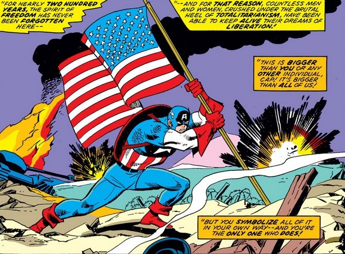 А значит, впереди комикс Captain America #176. Капитан Америка тоскует, обдумывая увиденное и вспоминая заодно свой ориджин. Патриотом Стив Роджерс был всегда, но во время призыва его забраковали – слишком тощий да слабый. Поэтому он без раздумий согласился на экспериментальную программу. Стива обкололи сывороткой суперсолдата и облучили Вита-Лучами – но затесавшийся шпион убил профессора, который не вёл записи, и рецепт создания суперсолдата был утрачен, и Стив Роджерс стал единственным результатом программы. Капитан Америка сражался с нацистами (ему в этом помогал малолетний напарник Бакки), затем Бакки погиб, а Кэп замёрз, разморозили его только в 1960-е, и с тех пор выпил он ушат дерьма. Кэпа пытается утешить Тор, напомнив, как Капитан Америка помог Мстителям в сражениях с многочисленными врагами. Потом ещё и Железный Человек лезет с советами (кстати, с этой сценой связан один популярный на западе мем, подробнее в комментах). “Кэп, у таких, как мы с тобой, есть ответственность перед народом! Смотри, ты помог целой куче людей! – Ага. И мою помощь начали принимать как что-то, само собой разумеющееся, ещё и выделываться начали, жестоким линчевателем звать, врагом народа...”.