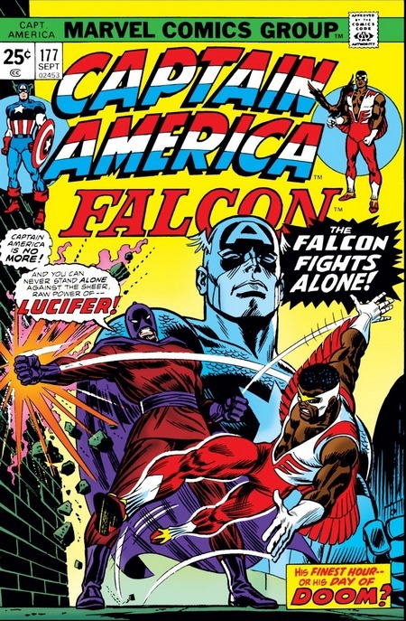 Но пост продолжается в комиксе Captain America #177 за сентябрь 1974 года, от тех же Энглхарта и Бушемы. Если в прошлом выпуске Стив Роджерс похоронил роль Капитана Америки, почему сейчас Капитан и Сокол сражаются с какими-то бандитами? Раскидывают бандитов, вламываются в замок, чтобы уничтожить бомбу “Мозголом”, а та взрывается! И тут Сокол просыпается. Приснится же такое! Да...Капитана Америки действительно больше нет. Сокол стрессует – выгорел, по сути, символ невыгораемости, стойкости и непоколебимости американского духа. Сэм Уилсон решает поговорить со Стивом, убедить его сходить с ним на патруль (тем более, Стив всё ещё, будучи бездомным и безработным, живёт на диванчике у него в офисе), но Роджерс непреклонен: Капитан Америка всё. “Ну и ладно! Только не лезь ко мне с нравоучениями! Раз ты мне больше не напарник, я не обязан к тебе прислушиваться”. Так что Сокол отправляется на патруль сам, с Редвингом, заодно пытаясь выяснить, не является ли он мутантом (Ксавьер же упомянул “паранормальный мозг” и необычную связь с птицами). Между тем, где-то в параллельном измерении злой инопланетянин по имени Люцифер находит редкий минерал, который позволяет запитать машину для переноса на Землю. Он намерен мстить своим врагам!