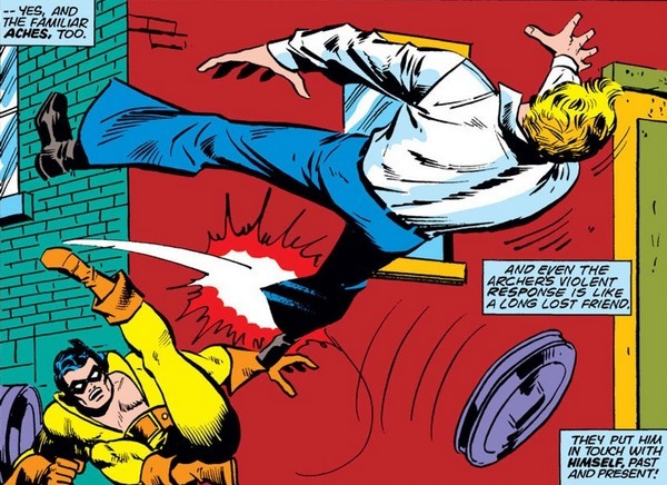 Ну, проблемы пернатых – это проблемы пернатых, а я перехожу к комиксу Captain America #179. Стив Роджерс продолжает наслаждаться жизнью без Капитана Америки – можно и с Шерон Картер погулять, и просто расслабиться. ВНЕЗАПНО по нему и Шерон кто-то начинает стрелять из лука! Неизвестному лучнику удаётся пригвоздить Стива к стене за одежду...хорошее было пальто, но Стив рвёт его в клочья, чтобы освободиться. Лучник говорит преувеличенно архаично и напыщенно. “Сила твоя столь велика, как мне говорено было, и ты столь же низок! Знай же, о смерд: имя мне – Золотой Лучник! И вот моя воля: Трижды мы встретимся, трижды сразимся, и на четвёртый раз Стив Роджерс умрёт!”. И действительно – в следующий раз Золотой Лучник нападает, когда Стив бьёт грушу в спортзале, и скрывается – Стив не успевает его догнать. Между тем, байкер “Шрам” Терпин читает в газете о неудавшемся Кэпозаменителе (Рассо) и думает – а фигли нет-то? Чем я не Капитан Америка? Бейсболист просто лохом был, вот лапку и сломал, я же не лох!
