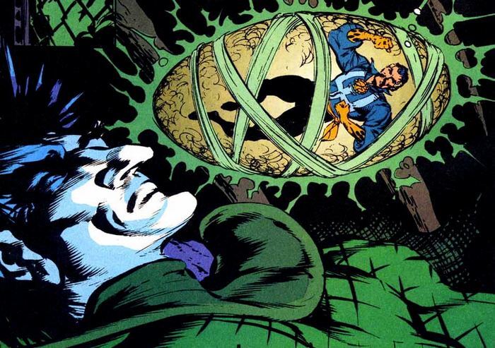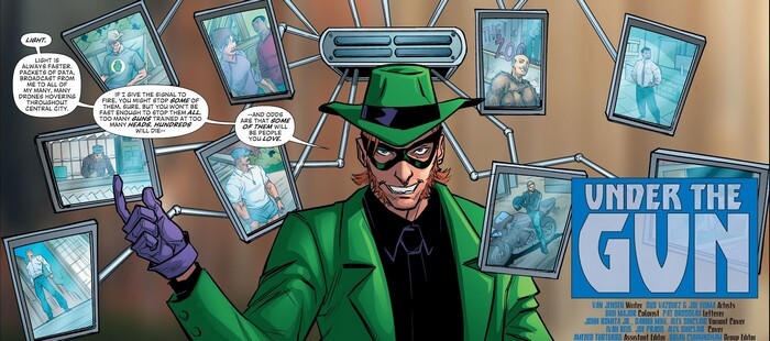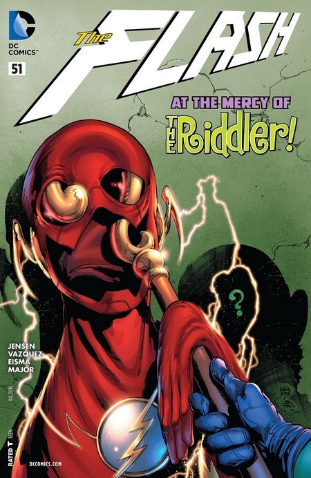 Обложка комикса The Flash #51 активно спойлерит, кто же последние несколько выпусков добивается эпического поражения Флэша. К Флэшу выходит тот, кто строил против него козни – Эдвард Нигма, Загадочник (меня иногда спрашивают, как так получается, что суперзлодеи донимают только "своих" супергероев...вот пример обратного). Рыпаться Флэшу не рекомендуется – на него смотрят стволы многочисленных пушек нескольких беспилотников. Негодяи – всего лишь пешки Загадочника. Негодяи уходят, чтобы помочь Лизе Снарт, которая по вине Загадочника впала в кому – но обещают вернуться. А Загадочник предупреждает Флэша, чтобы тот даже не думал об ускорении. «По Централ Сити летает больше сотни беспилотников, на тебя нацелена лишь дюжина, остальные – на обычных людей. Ты можешь уничтожить часть из них – но точно не все. Попрёшь на меня – и погибнут сотни людей. Просто ускоришься – и погибнут сотни людей. Так что стой смирно...». И Флэш вынужден стоять смирно, а Загадочник вооружается кастетами и использует Флэша в качестве боксёрской груши.