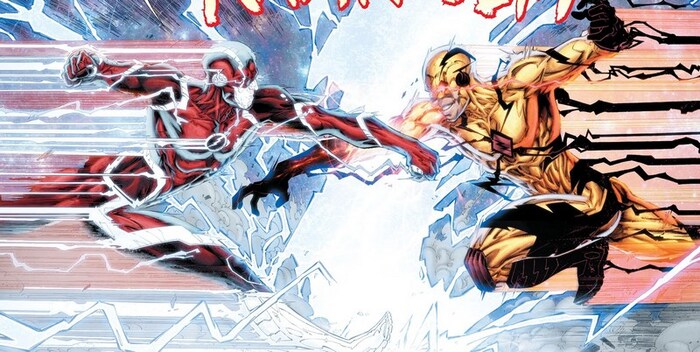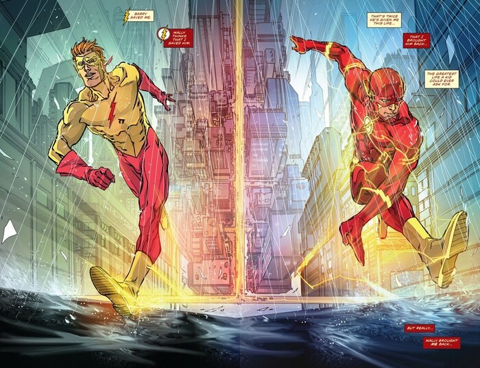 Так заканчивается эпоха New52 и начинается Rebirth, а связующим звеном между тем и этим является комикс Flash: Rebirth (не путать с The Flash: Rebirth, который уже был ранее), с историей от Джошуа Уильямсона и рисунком от Кармайна Ди Джандоменико. Барри Аллен, криминалист полиции Централ Сити, расследует убийство, которое во многом напоминает убийство его матери – точно так же первый подозреваемый – муж погибшей, единственный свидетель – маленький ребёнок, который утверждает, что убийство совершил монстр. В процессе что-то идёт не так – Барри на мгновение кажется, будто он видит рыжего парня в костюме, похожем на костюм Флэша, и этот парень зовёт его по имени, после чего Барри видит не менее странного мужчину в белом костюме Флэша, а затем Профессора Зума – но видение обрывается так же внезапно, как и началось. Через некоторое время видение о рыжем скороходе повторяется. Парень зовёт Барри по имени – и пропадает, а Флэш уже и не знает, то ли он с ума сходит, то ли Спидфорс пытается ему что-то сказать.