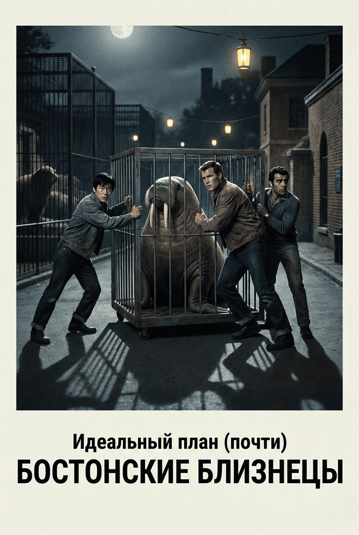 Часы пробили полночь, когда трое парней крались по заднему двору зоопарка. Лунный свет скользил по решёткам клеток, превращая их в жуткие силуэты, а редкие фонари отбрасывали длинные, дрожащие тени. Скрип колёс клетки с моржом звучал так громко, что казалось, будто он способен разбудить весь город.