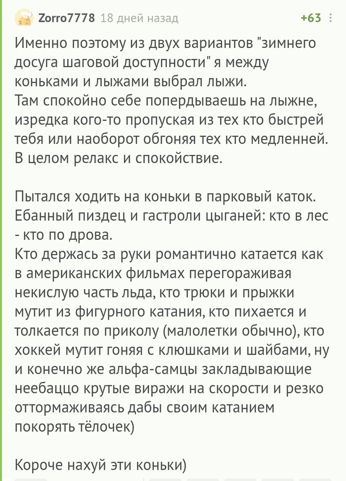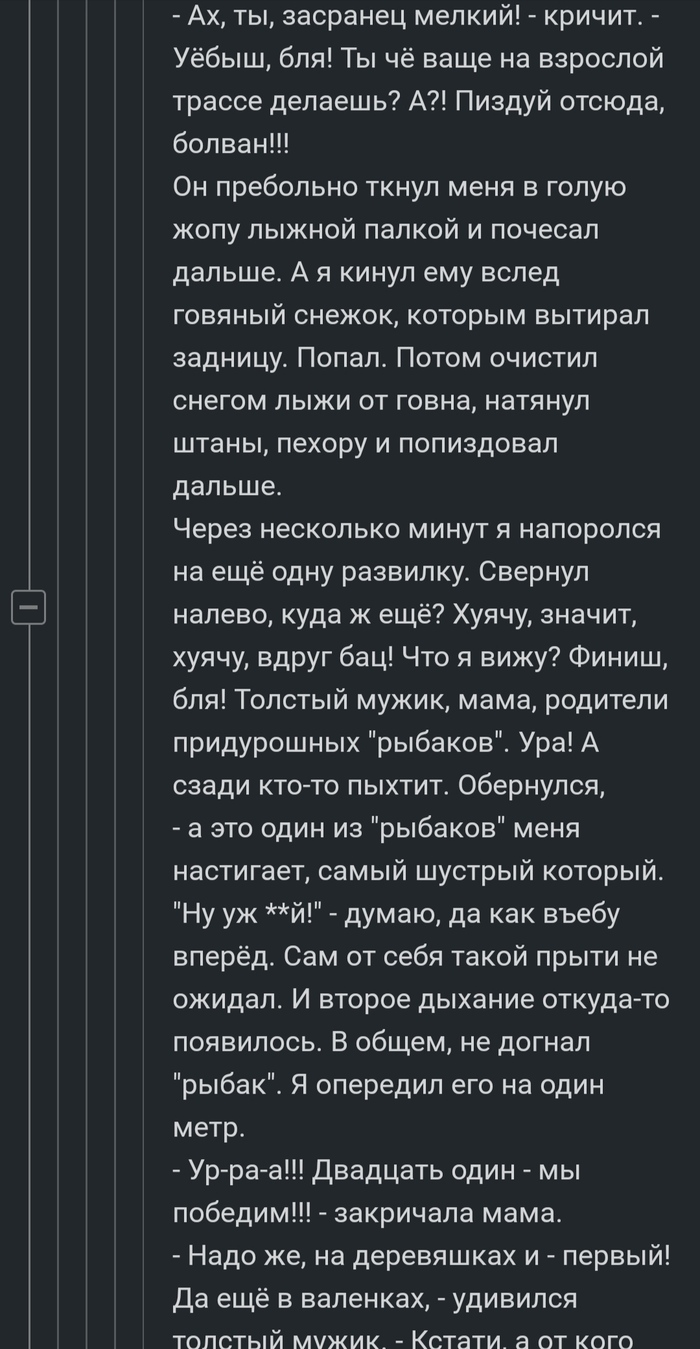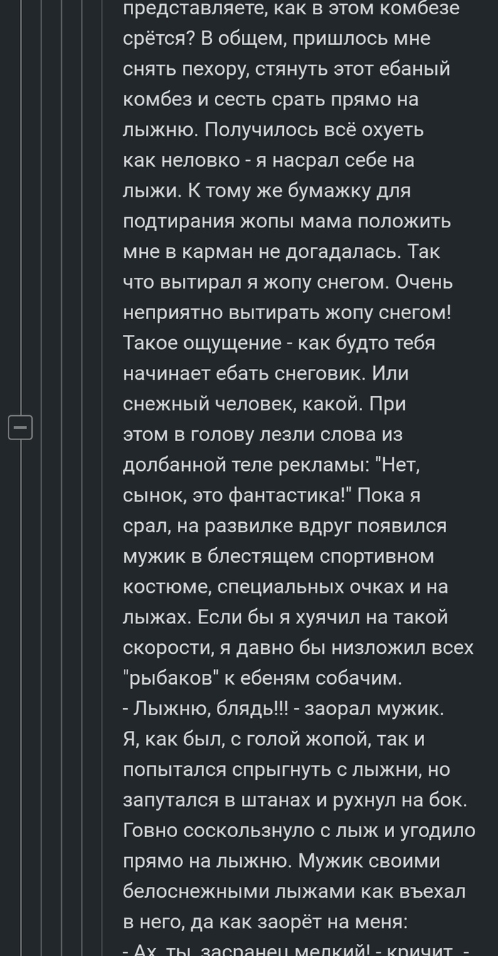 - Ах ты засранец мелкий! — кричит — Уебыш бля! Ты чего вообще делаешь на взрослой трассе? Пиздуй отсюда! — и пребольно ткнул меня в голую жопу лыжной палкой, а патом почесал дальше. А я ему вслед кинул гавняный снежок, которым вытирал жопу. Попал.