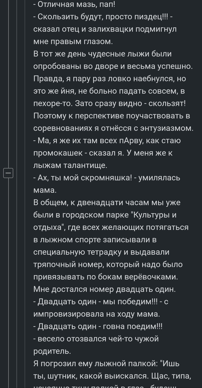- Какие же придурки эти мальчишки — сказал я. — Зачем им рыбацкие лыжи? Мы ж не на рыбалку собрались, а на гонку. А поодевались-то как, фраера: одни шерстяные костюмы, какие-то совсем несерьезные ботинки, которые к лыжам перестегиваются, да шапочки с неприличным названием «петушки». Разве они не видят, что зима на дворе? Холодно ведь до опиздинения. Рыбаки, бля. Модники нахуй. То ли дело я: на ногах — штаны -комбез, туловище надежно защищено от морозов и ветров пехорой, на голове — кроличья шапка на резиночке, на руках — меховые рукавицы (тоже на резинке, чтоб не проебал). Ну и валенки конечно. Я ж не рыбак. Я нормальный.
