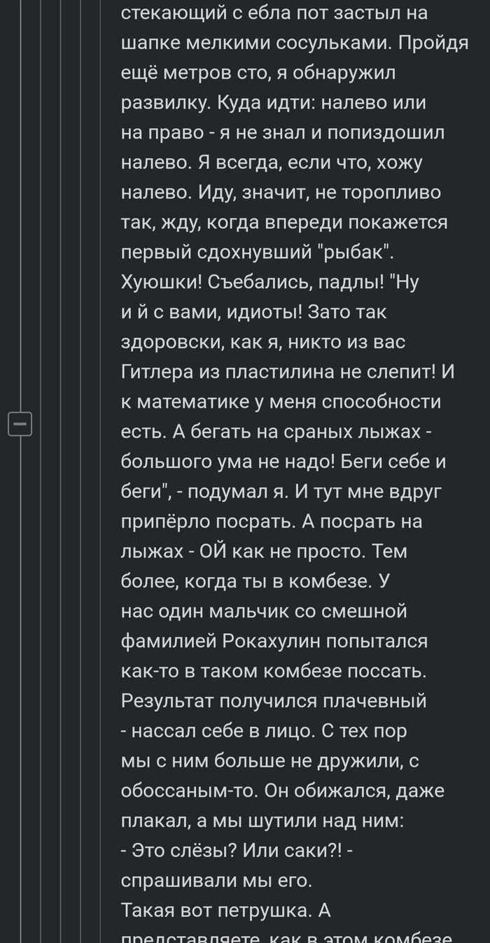 «Ну и хуй с вами, идиоты» — думаю — «Зато так здоровски, как я, никто из вас Гитлера из пластилина не слепит. И к математике у меня способности есть. А бегать на сраных лыжах большого ума не надо. Беги себе и беги. Тут мне вдруг приперло посрать. А посрать на лыжах ой как непросто. Тем более, когда ты в комбезе. У нас один мальчик со смешной фамилией Рокахулин попытался как-то в таком камбезе поссать. Результат получился плачевный — нассал себе в лицо. С тех пор мы с ним больше не дружили, с обоссаным-то. Он обижался, даже плакал, а мы шутили над ним : «Это слезы» — спросим — «или саки?».