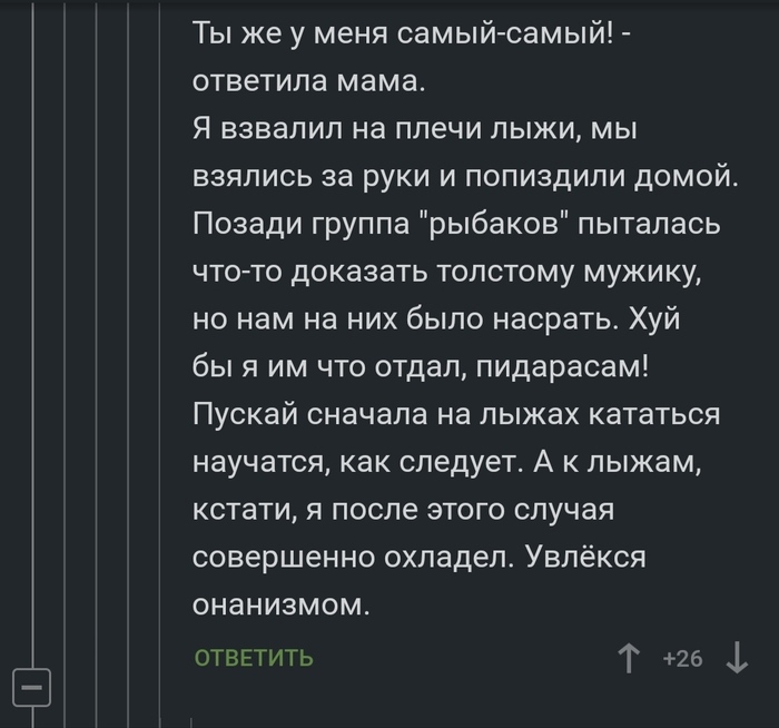 Я взвалил на плечи лыжи, мы взялись за руки и попиздили дамой. Позади группа рыбаков пыталась что-то доказать толстому мужику, но нам на них было насрать. Хуй бы я им что отдал, пидарасам. Пускай сначала на лыжах кататься научатся как следует. А к лыжам, кстати, я после этого случая совершенно охладел. Увлекся онанизмом.