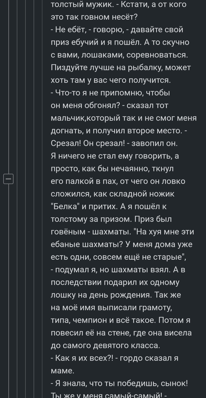 - Не ебет, — говорю, — давайте свой приз ебучий и я пошел А то скучно с вами, лошаками, соревноваться. Пиздуйте лучше на рыбалку, может хоть там у вас чего получится.