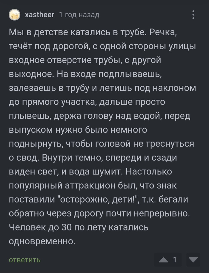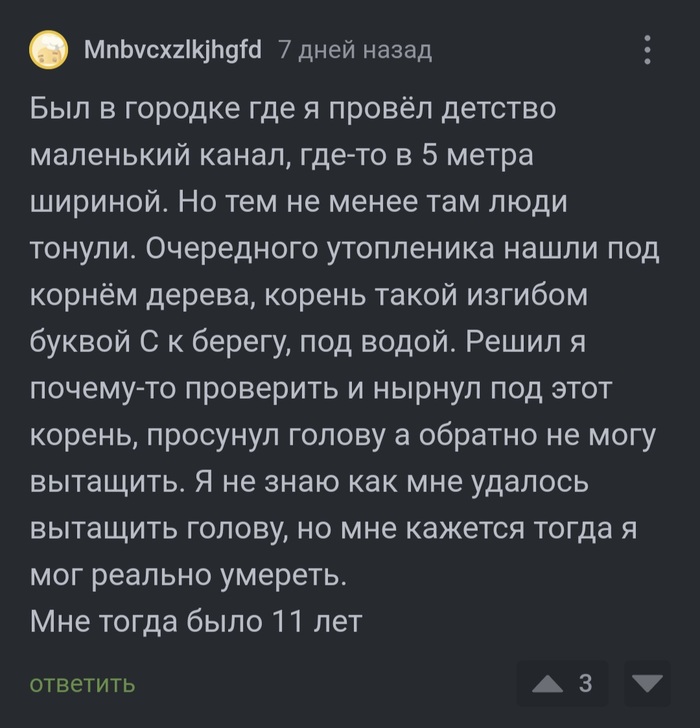 Разблокировано воспоминание. Деревня, лето, маленькая речушка, но там есть место для купания: "ямка" достаточно большая и глубокая. Мелкий я, увидел бревно и решил, что неплохо бы его оседлать и как герой вестернов поплавать по реке. Сказано - сделано. Я сажусь на бревно и как первопроходец на диком западе плыву вниз по течению. Только я не учел, что когда попадешь в глубокое место то бревно перевернется и ты окажешься внизу. Я вцепился в бревно и оно начало реально крутится, я то снизу, то сверху. Слава Б-гу пацаны постарше меня вытащили)) Вот так я не стал пионером дикого запада.....но зато остался жив. Это был 1 раз когда я не утонул. Если история наберет 50 лайков я расскажу 2 раз как я чуть не утонул)))))