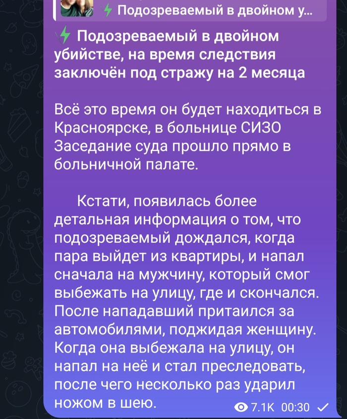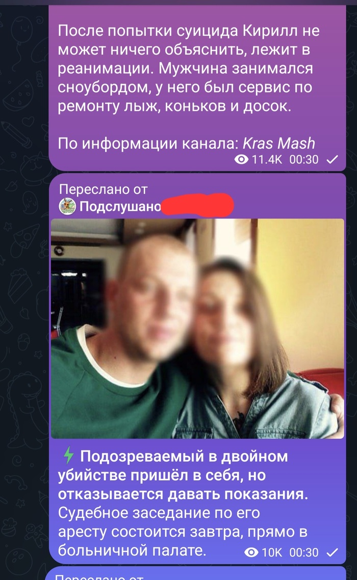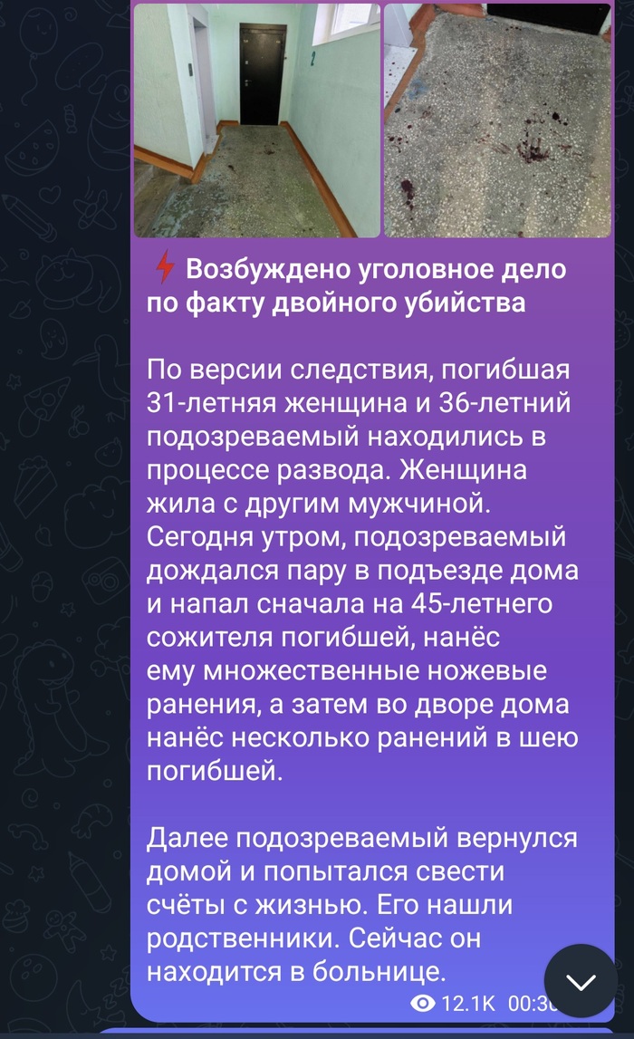 У неё осталась дочь 5 лет, ребёнок убийцы. У сожителя дочь 15 лет, матери нет, тоже сразу стала сиротой. Семья не маргинальная. Видео с местного ресурса выложить не получается, но женщина на улице страшно кричала, когда он её резал. С уличных/подьездных камер этих видео штук 5