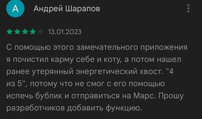 Супер приложение. После последнего обновления мой кот перестал ссать в тапки, а тёща наконец уехала домой. Спасибо разработчикам.