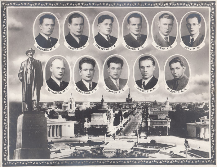 Группа состояла в основном из выпускников школ 1950 г., но были и раньше окончившие среднюю школу. Парторг (секретарь партийной орг.группы) В.А. Чернышев отслужил в армии, староста группы Н.И. Живчиков попал в плен и работал в Доре, где немцы изготовляли ракеты. Никаким ущемлениям он не подвергался. Комсоргом группы ( секр.комсомольской орг. группы) был я. Я привожу фотографии студентов ещё и потому, что, быть может, кто-то из их потомков прочитает этот пост и установит связь со мной.