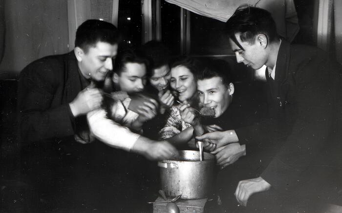 В то время цены не повышались (инфляции не было), а каждый год снижались в среднем процентов на 5. Мы продолжали подрабатывать на разгрузке вагонов. Но для удешевления питания мы образовали «коммуну», складывались по 200 рублей в месяц (точно не помню), покупали продукты и готовили первое блюдо на обед, в основном гороховый суп в большой алюминиевой кастрюле. Часто к нам на обед приходили студенты и из других комнат. На рис.4 это показано в утрированном виде. Конечно, все из одной кастрюли так повседневно не ели.