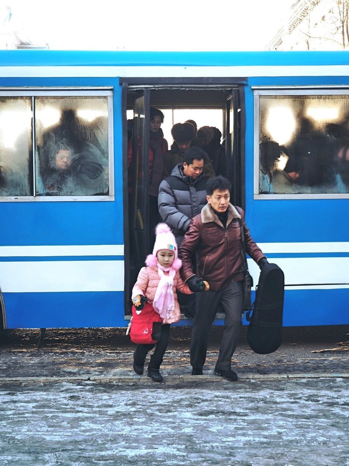 У Северной Кореи очень теплые отношения с Китаем. Ну иначе им и нельзя - по сути, это давно китайская провинция. 70% грузооборота проходит через китайские железные дороги и порты, 3\4 авиарейсов из Пхеньяна выполняются в Китай(Пекин, Шеньян, Шанхай), практически вся техника в СК поставляется из Китая, а также(что самое главное) - китайские туристы, которых любят во всем мире. В Северной Корее просто огромное количество туристов из Китая. Это утренняя развозка на экскурсии из нашего отеля.