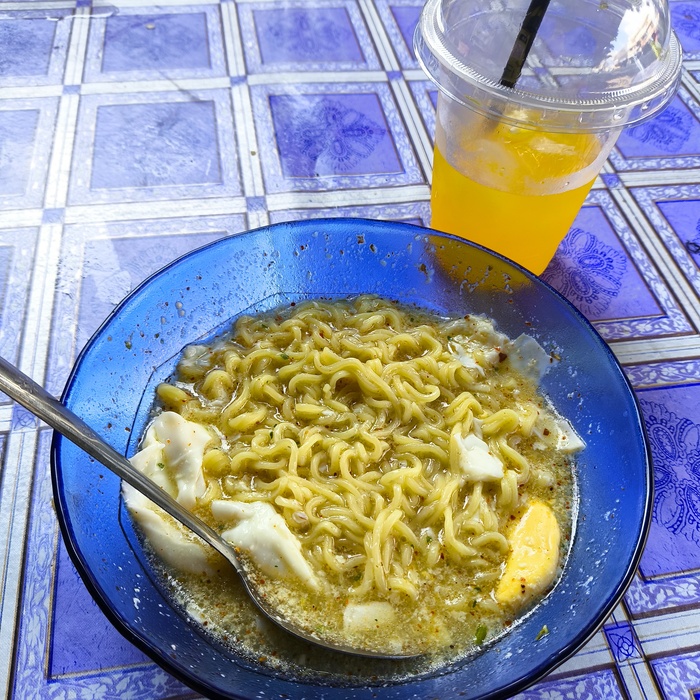 Еда на окраине города стоит совсем недорого, хотя и назвать её чем-то полезным сложно. Сок из порошкового пакетика 12 рублей, лапша с яйцом 70. Для перекуса пойдет. Нужна энергия.
