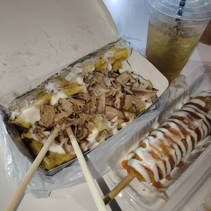 Не нашёл. Кругом масса закусок и японско-корейских кафешек, белого риса и курицы... Свой выбор остановил на какой-то японской пицце и корндоге.