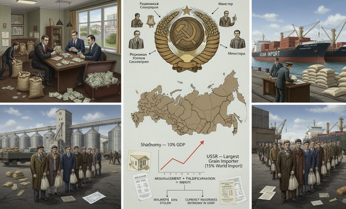 Куда девалось зерно? Часть — реально терялась из-за бесхозяйственности, плохого хранения, воровства при перевозке. Часть — приписывалась на бумаге, но никогда не выращивалась. Часть — расхищалась и продавалась на черном рынке. А руководство страны, вместо того чтобы навести порядок, предпочитало закупать миллионы тонн пшеницы за границей, тратя валюту и загоняя экономику в долги.
