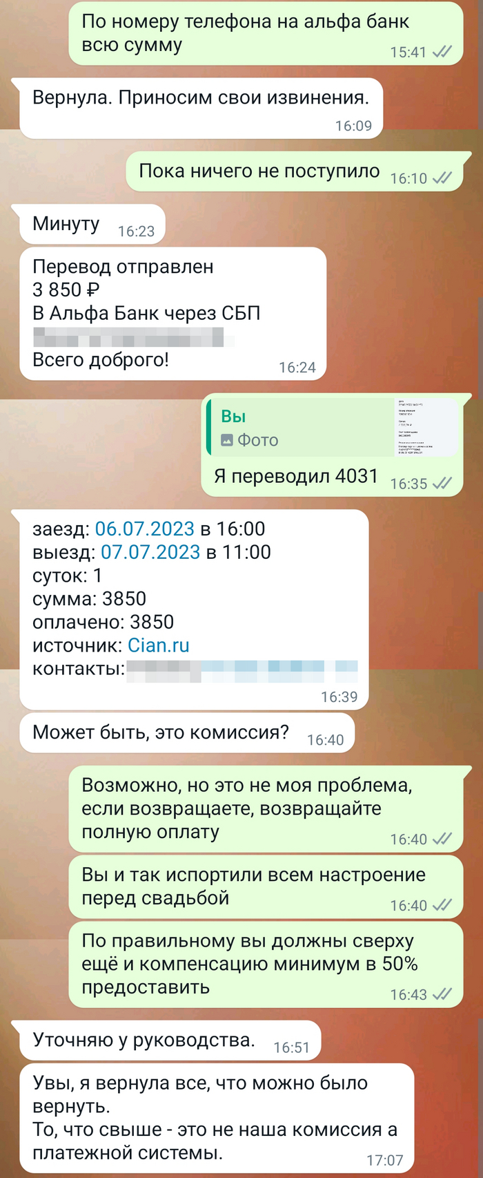 Звоню по контактам из ЦИАН, уточняю по возможности брони на сутки, за месяц до назначенной даты. В обоих вариантах квартира свободна, пришлют мне ссылки на оплату в Whatsapp (можно сравнить оперативность ответов уже на примере):
