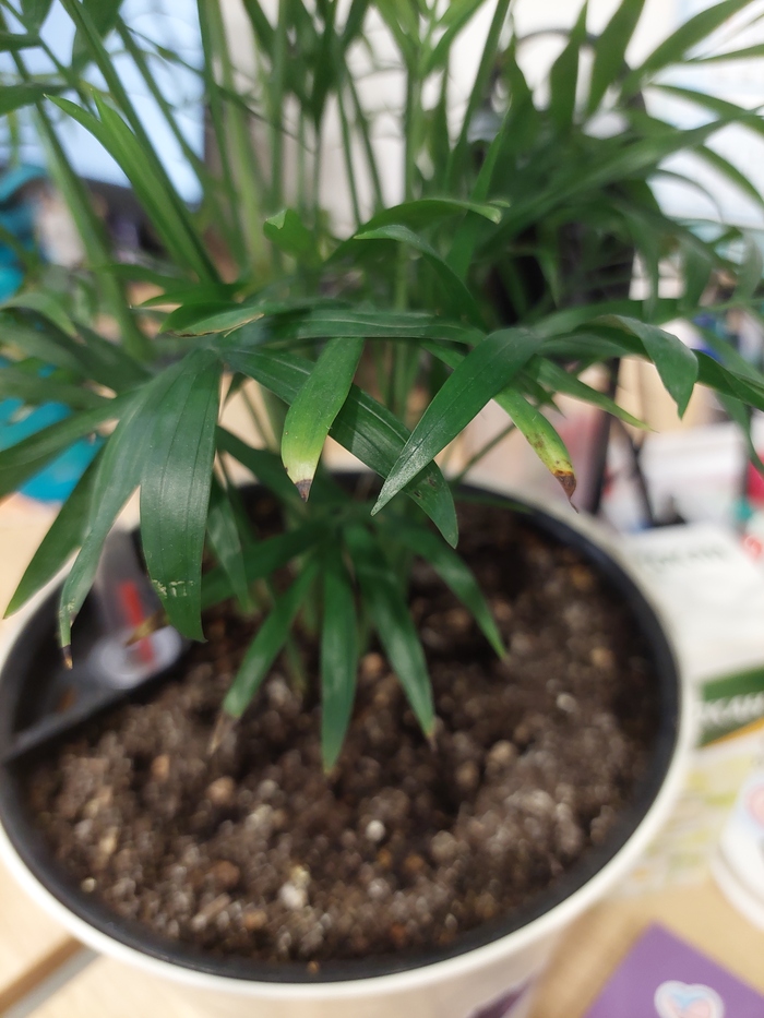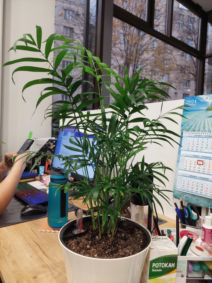 Верю в силу Пикабу. Помирает пальма хамедорея. Помогите, пожалуйста, кто разбирается в комнатных растениях. Гугл и Яндекс мою глупую голову не вразумили: я не могу понять, то ли света ей много (стоит на окне, где после 12 и до заката всегда солнце, но штора прикрыта), то ли почву перелила, то ли подкормка нужна.