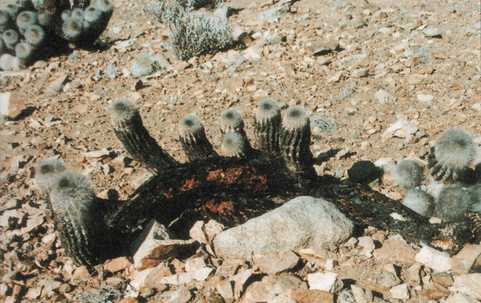 1 фото) Из книги Рудольфа Шульца "Копиапоа". Старая C. krainziana испытывает стресс. Процесс жертвы нижнего стебля помогает и поддерживает ограниченное цветение и производство семян от все еще наполненных водой клеток в верхушках.