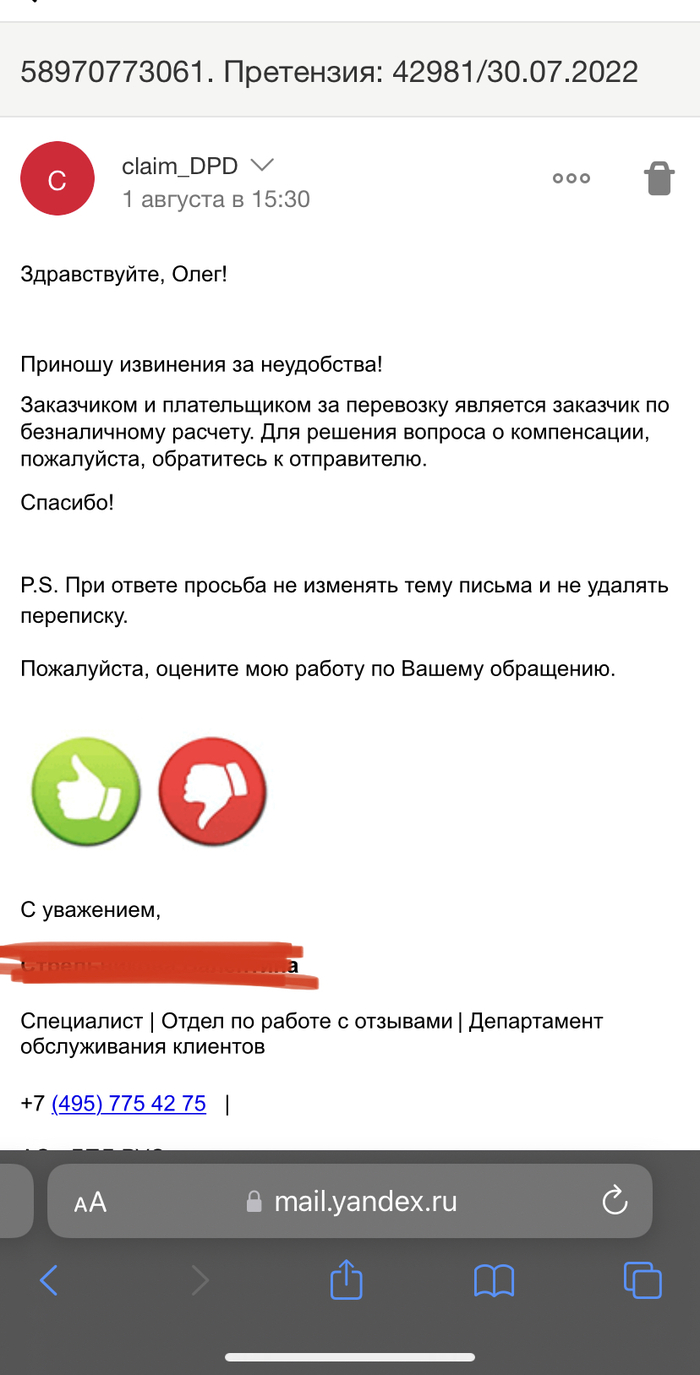 Я почти сразу же стал писать в службу поддержки DPD. Там морозились. Затем написал претензию. Ответ по ней долго не хотели давать. В итоге, прислали ответ, что посылка нашлась.