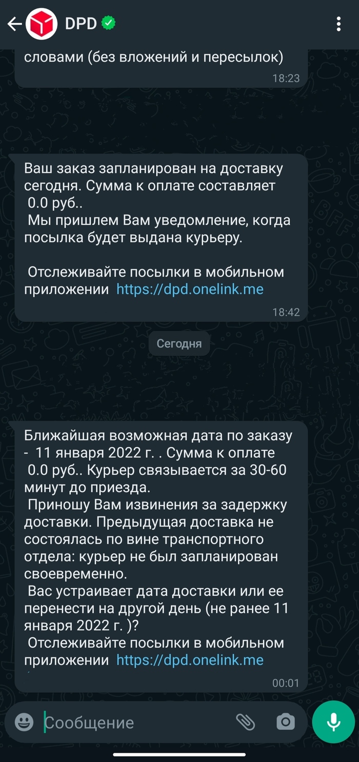 В итоге с 30.11 по 20.12 я звонил 7 раз в это DPD, где надо было просидеть слушая мелодии по 45 мин, чтобы мне назначили курьера. Как понимаете курьера никто так и не назначил, за дополнительную плату какой-то другой курьер у них не может привезти, самовывоз тоже организовать нельзя с того места, где хранился телевизор. Хотя несколько раз приходили смс, что завтра привезут, но никто не приезжал...