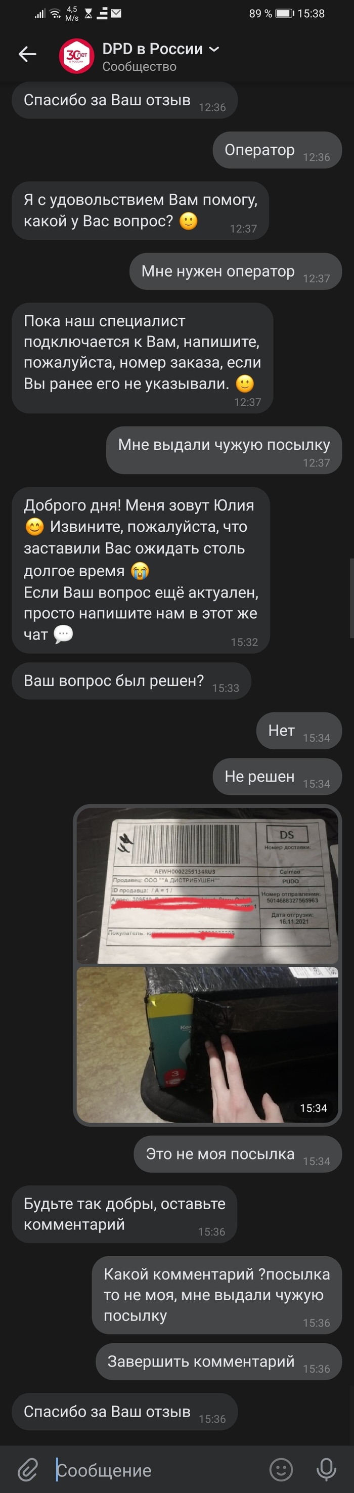 17 декабря купил в Oysho подарок для жены, оплати на сайте. Магазин решил отправить мою покупку через DPD. Доставка по Москве. Доставить должны были 18 декабря. Ну ок. Жду. Приходит смс с данными по доставке, ссылка на отслеживание, данные курьера, его номер телефона, интервал доставки с 13 до 18 часов, должен позвонить за 30 минут до визита. Жду и думаю, позвоню курьеру и уточню по времени, потому что у меня на работе началась суета и мог бы разминуться с курьером. Звоню - номер занят, звоню через 15 минут - нет ответа, перезваниваю через 5 минут - сброс вызова. До 18 часов еще где-то 2,5 часа. Вообщем я звонил раз 7, все звонки сбрасывадись и соответственно, посылку мен не доставили. Захожу посмотреть в статус доставки, а там возврат на терминал. На следующий день приходит смс о том, что назначен новый курьер, интервал дрставки тот же. Звоню курьеру - номер недоступен. Вообщем мне не доставили заказ. Звоню в поддержку, объясняю ситуацию, мне там говорят, что вот точно прям завтра доставим, вот прям 100%. Курьера проверим и покараем. Ждите, вот 100 пудов вам привезут. Опять не привезли. Я захожу в личный кабинет и меняю доставку курьером на самовывоз из пункта выдачи. Делаю я это 22 декабря. На следующий день звоню в поддержку и спраштваю, че там с моей доставкой. Мне говорят хз, у нас данные не обновились, после смены способа доставки надо подождать 2 суток, чтобы у нас в программе произошли изменения и через 2 дня вам 100% доставят в пугкт самовывоза. Прохожит 2 суток, смотрю в личном кабинете статус доставкт, а там по прежнему "Доставляется в пункт самовывоза". Так вот. Я уже 9 дней не могу получить свою покупку из-за конченого DPD. Они что с Oysho в паре работают? Что за фуйня вообще? У кого еще такие случаи были с этими 3,14ДоРаМи?