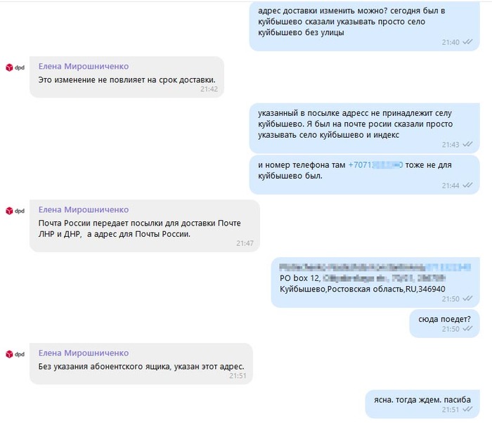 8.11.2021 я решил уточнить куда приедет посылка т.к. в отправлении указано доставка до двери, что меня собственно и смутило. Позвонил на горячую линию, звонить в роуминге то еще удовольствие, особенно когда тебе рассказывает робот 2 минуты до оператора, а потом еще слушать замечательную мелодию минут 5-10. Ожидание проверок посылки по 5 минут то еще удовольствие, ждешь и понимаешь, что тот светильник растет в цене каждую минуту. По итогу переговоров с оператором DPD выяснилось, что курьер посылку забрал, доставку будет осуществлена по плану согласно адреса указанного на посылке т.е. с. Куйбышево на несуществующий адрес т.к. адрес указан для дальнейшей пересылки в ДНР. Для изменения адреса доставки попросили позвонить 9.11.2021г., т.к. с курьером нельзя связаться, и можно будет договорится с курьером чтобы забрать где ни будь в Куйбышево.