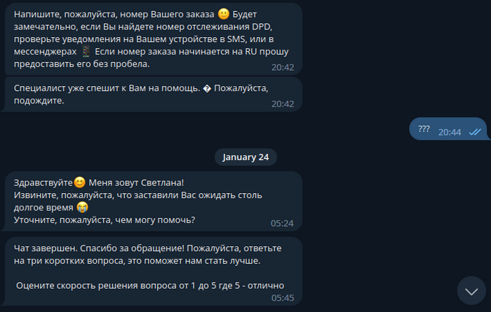 Звоню по телефонам — там только робот, который повторяет ту же информацию, определив номер заказа по моему номеру телефона. Никаких «нажмите ... для связи с оператором». При нажатии нуля просто сбрасывает звонок. Пишу в телеграм — там аналогично: после ввода номера заказа повторяется одна и та же информация, а мифический оператор появляется лишь через 9 часов глубокой ночью, и то только чтоб завершить чат.