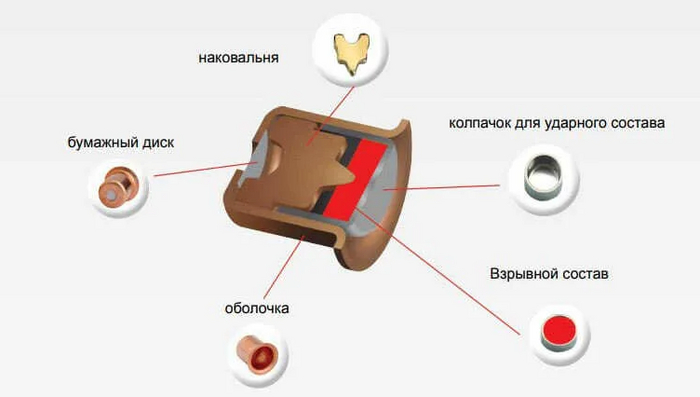 Капсюль-воспламенитель инициирует взрыв порохового заряда. Существуют различные типы капсюлей: