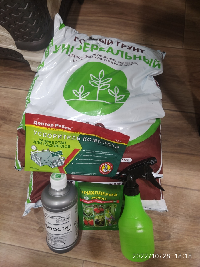 На авито были куплены десятилитровые вёдра 5 шт по 40руб за единицу, в леруа грунт, пульверизатор и ускоритель компостирования. Готово!
