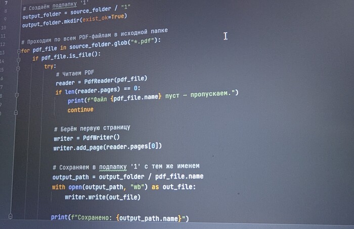 1. Момент - работа с пдф. С десктопными приложениями здесь все неплохо, но раздувая функционал, они набирают вес и теряют скорость. Поэтому для себя лично гонял для этих целей python. Собственно вот решение задачи - вырезать только первый лист у 400+ файлов весом от 1 до 400мб.