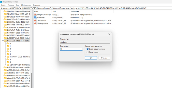 В параметре Attributes меняем значение с 1 на 2. Это нужно, что-бы открыть по умолчанию скрытые настройки электропитания.