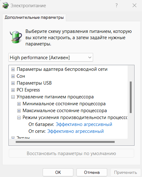 4. Находим пункт Управление питанием процессора\Режим усиления производительности процессора. По умолчанию это настройка скрыта и стоит режим Агрессивный или Агрессивный при гарантированном. Меняем его на Эффективно Агрессивный для питания от сети и от батареи. Примечание: иногда бывает, что при Эффективно Агрессивном режиме так же возникают BSOD, тогда нужно просто установить на Эффективный, вроде бы никто не отписывался, что на нем были проблемы.