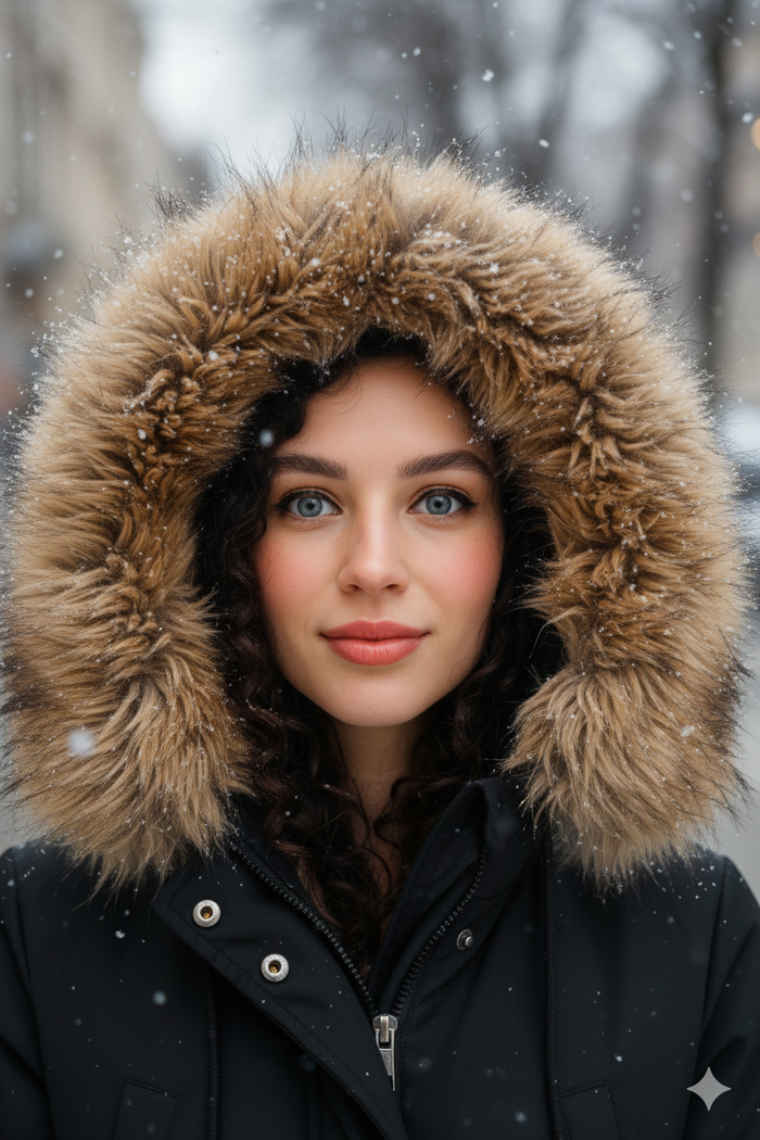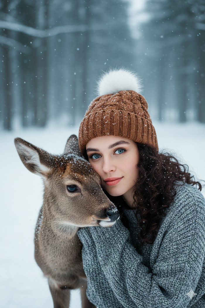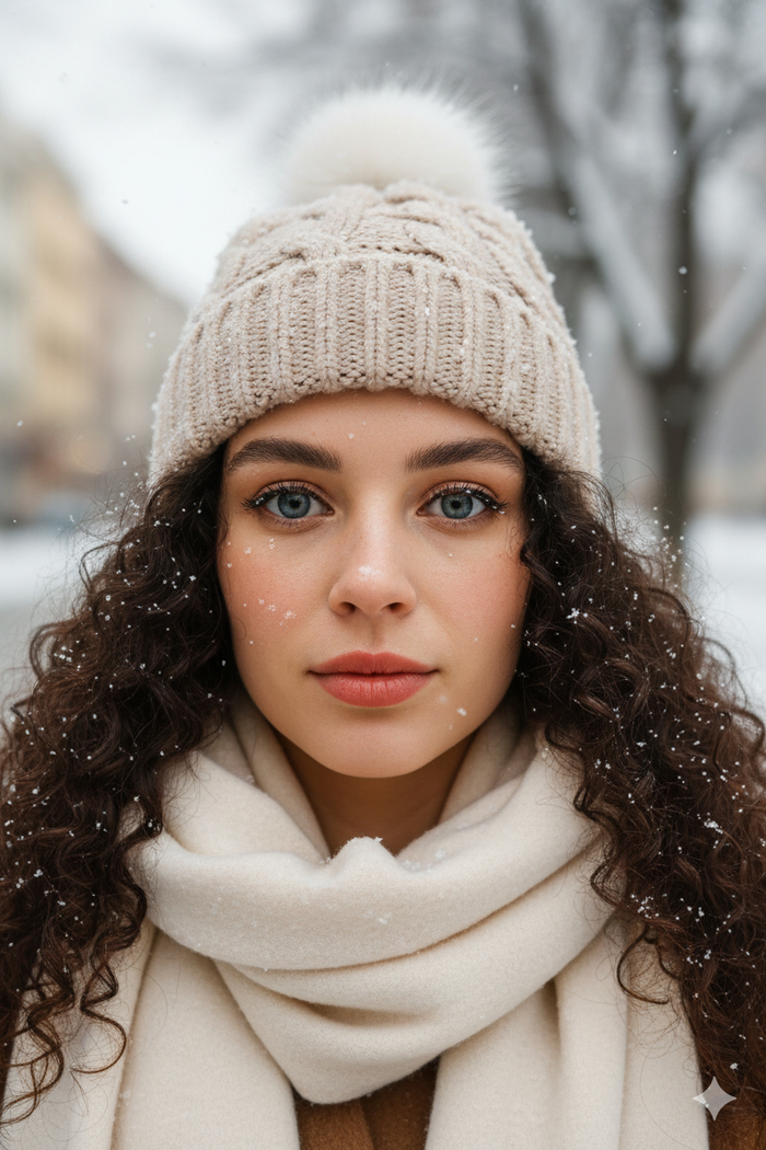 Создайте гиперреалистичный зимний портрет женщины в экстремально крупном плане, сосредоточенный на её лице. На ней мягкая вязаная бежевая шапка с белым помпоном, свободно прилегающая к её волосам, и кремовый шарф, элегантно обёрнутый вокруг шеи. Снежинки нежно оседают на её ресницах, щеках и шапке, добавляя нежную зимнюю деталь. Её выражение лица спокойное и задумчивое, с тёплым естественным румянцем на щеках от холода. Фон полностью размыт, показывая лишь намёки на заснеженные деревья или зимний пейзаж в мягком боке, создавая безмятежную интимную атмосферу. Освещение мягкое и рассеянное, как будто фильтруется сквозь облачное небо, подчёркивает детали её кожи и блеск в её глазах. Сверхвысокое разрешение, малая глубина резкости, реалистичная текстура кожи, кинематографичная зимняя эстетика. Сохраняй черты лица.