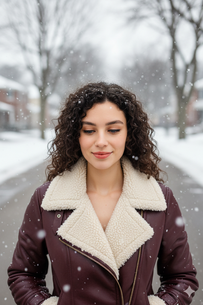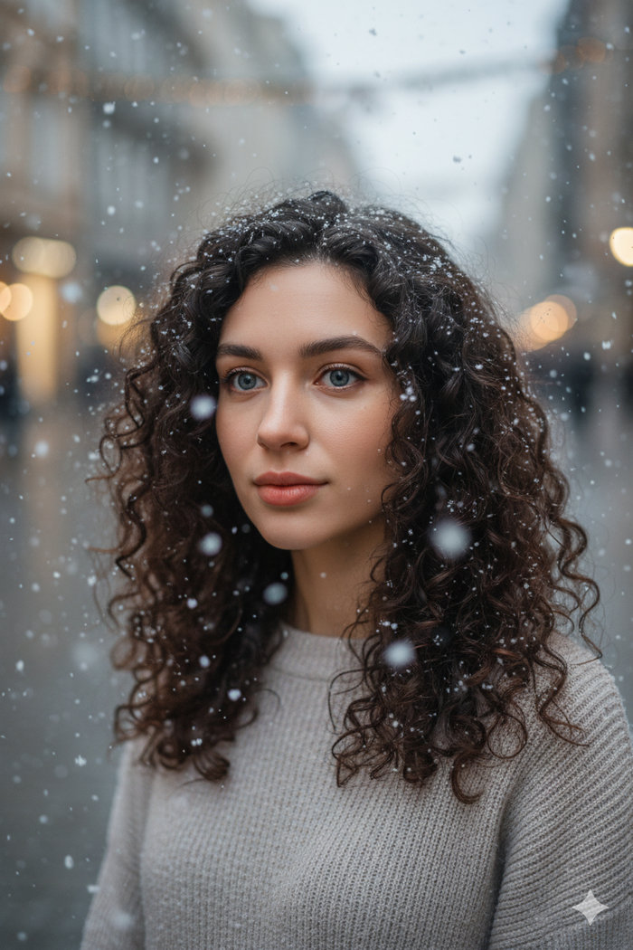 Портрет женщины крупным планом на городской улице во время снегопада. Вокруг неё кружатся хлопья снега, создавая безмятежную атмосферную сцену. На фоне — размытая городская улица с приглушёнными тонами и лёгким боке от уличных огней, создающая тихое, задумчивое настроение. Мягкое естественное освещение, малая глубина резкости и холодная цветовая палитра подчёркивают зимнюю атмосферу. Ультрареалистичная фотография высокого разрешения, эстетика объектива 85 мм, размытый городской фон. Сохраняй черты лица.