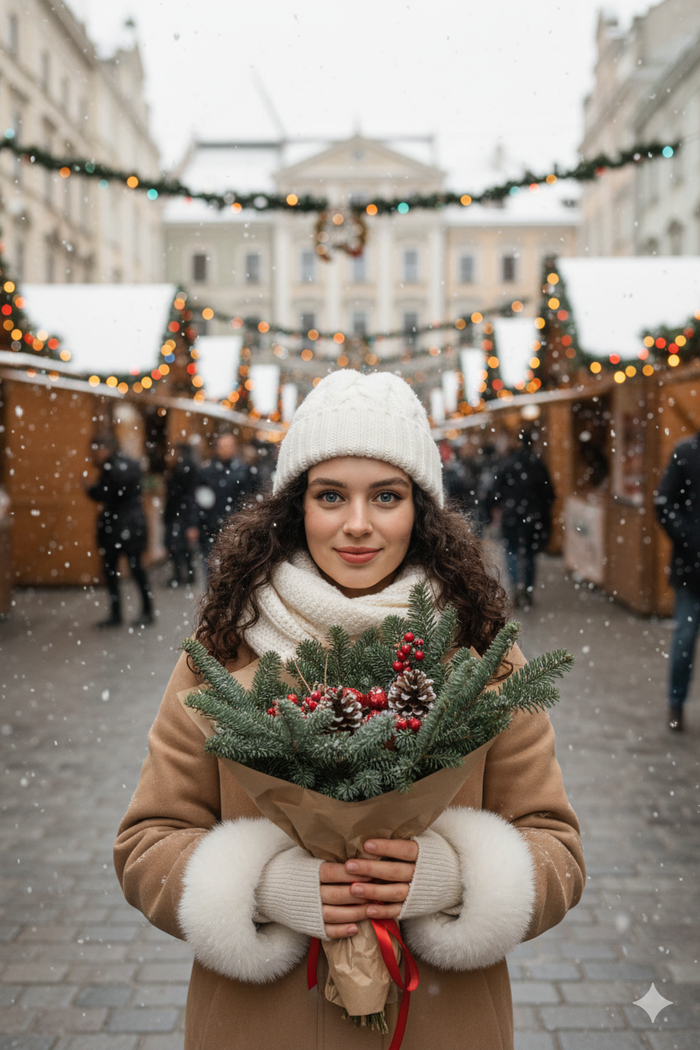 Создай уютную сцену зимнего рынка с женщиной, стоящей на открытом воздухе под мягко падающим снегом. Она в тёплой белой вязаной шапке, кремовом шарфе и светло-коричневом зимнем пальто с пушистыми белыми манжетами. В руках она держит букет свежих еловых веток, завёрнутых в крафтовую бумагу с маленькими красными ленточками. Выражение лица тёплое и радостное, освещено мягким рассеянным дневным светом. На фоне — праздничный рождественский рынок с размытыми разноцветными гирляндами и декоративными элементами, создающими эффект боке. Заснеженная архитектура в нежных пастельных тонах возвышается вдали, усиливая зимнюю атмосферу. Малая глубина резкости, мягкое естественное освещение, кинематографичная слегка обесцвеченная цветовая палитра для элегантной праздничной атмосферы. Сохраняй черты лица.