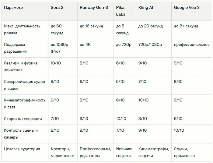 Сравнение нейросети Sora 2 с конкурентами: Runway, Pika Labs, Kling AI и Google Veo 3