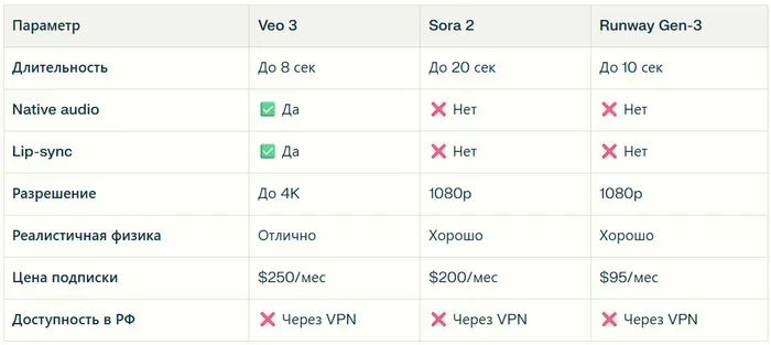 Как видно из таблицы, главный недостаток Veo 3 — ограничение по длительности (8 секунд против 20 у Sora 2), но это компенсируется возможностью создавать мультишоты через инструмент Scene Builder и склеивать их в единое видео. Зато наличие native audio и лучшая физика делают Veo 3 незаменимой для диалоговых сцен, интервью, подкастов и любого контента, где важен звук.