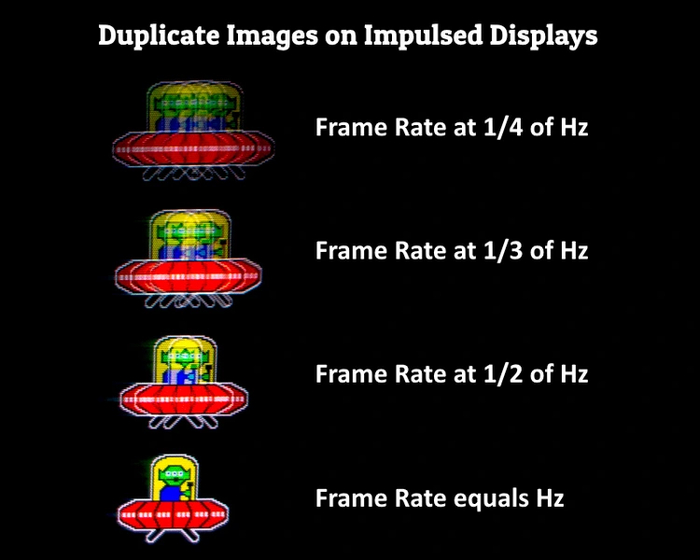 Обновление пикселей на экране происходит после прохода сигнала вертикальной развертки. Сигнал проходит по кадру быстро, но не мгновенно. Поэтому пиксели верхних строк начинают обновляться чуть раньше нижних. Если включение подсветки приходится на момент, когда часть пикселей обновилась не до конца, возникнет эффект перекрестных помех. Часть изображения начинает двоиться. Такой проблемой нередко страдают все предшествующие реализации стробирования подсветки.