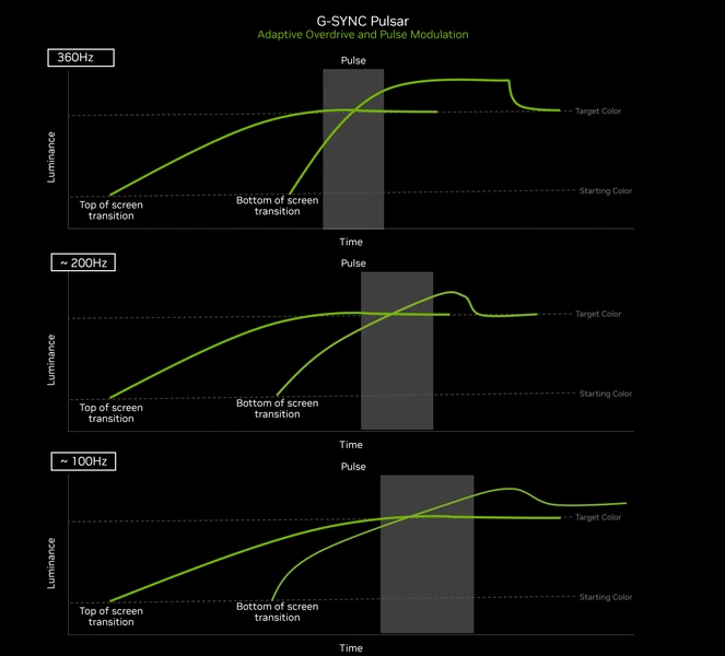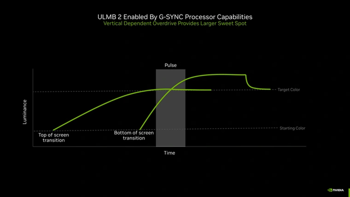Для устранения эффекта теперь используется Variable Overdrive — технология переменного разгона пикселей. С ее помощью ULMB 2 может переключать пиксели строк с разной скоростью, в зависимости от положения на экране. Переключение синхронизируется так, чтобы создать более широкое окно для импульса подсветки. Благодаря этому подсветка зажигается в точно отведенное время. Это устраняет перекрестные помехи, ранее вызывавшие двоение картинки.