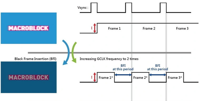 BFI снижает частоту мерцания (стробирования) подсветки, синхронизируя ее с частотой обновления матрицы. Благодаря этому лампы включаются в момент полностью обновленной картинки. После показа одного кадра лампы снова гаснут. Заново они загораются только в момент вывода следующего кадра.