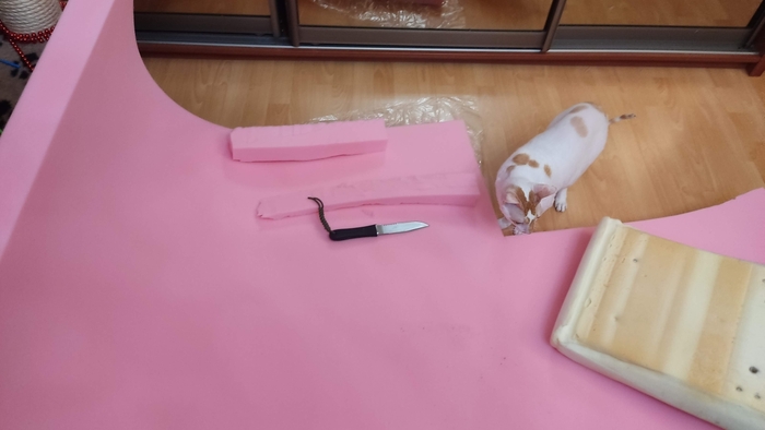 Потом пришел главный помощник и мы с ним вырезали примерную форму с припуском на "умнется", справа - старая "подушка".