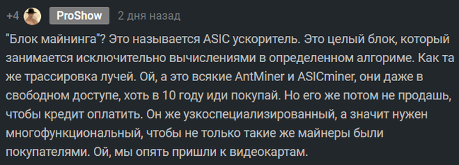 В последнее время я постоянно вижу нытьё по поводу высоких цен на видеокарты и в каждом посте обязательно винят майнеров и только их. Даже в таких постах, как этот, где явно высмеивается логике перекупов, всё равно, да найдутся одаренные и такие же будут их плюсовать.