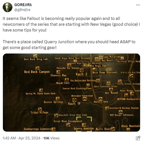 Некоторые из пользователей решили поиздеваться над новичками, которые рискнули вкатиться в довольно хардкорный New Vegas. Например, GOREJIRλ посоветовал всем, кто начал знакомство со вселенной с творения Obsidian, посетить место под названием Quarry Junction (Карьер), ведь там есть хорошее снаряжение, способное сильно подсобить на старте.