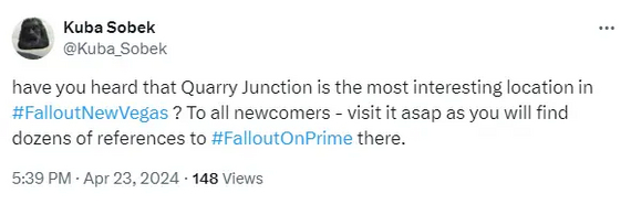 А вот Kuba Sobek решил ловить на живца. Зная, что новички пришли в New Vegas после просмотра сериала, он тоже направил их в Quarry Junction (Карьер), потому что там можно найти кучу отсылок на «Фоллаут» от Amazon.