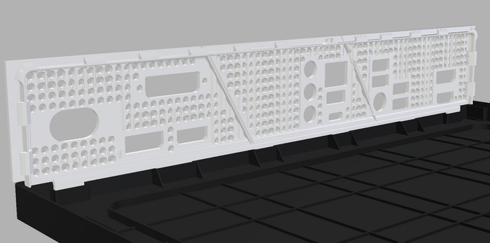 За основу были сняты размеры с оригинальной планки, в 3D перенесены все крепления и изгибы, после чего мне осталось выдавить отверстия, углубления, вытянуть ребра жесткости и разрезать модель на 3 части - таким образом, подготовить к печати.