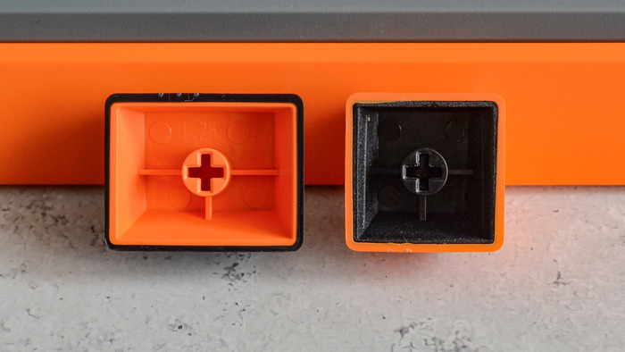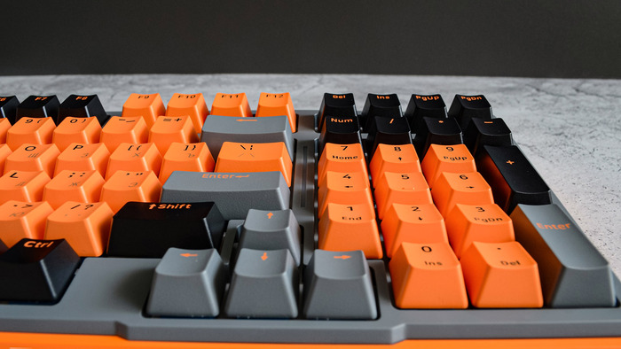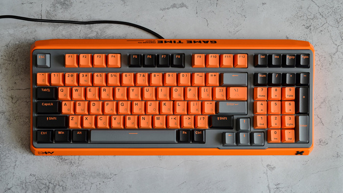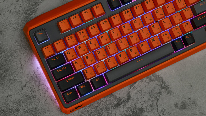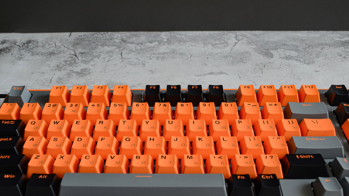 Кейкапы средней высоты с профилем OEM – небольшая вогнутость центральных рядов клавиш, а основная часть клавиш имеется ощутимую вогнутость. Изготовлены кейкапы из PBT-пластика – наиболее долговечный вариант.