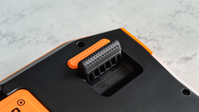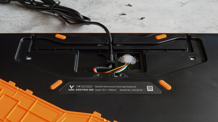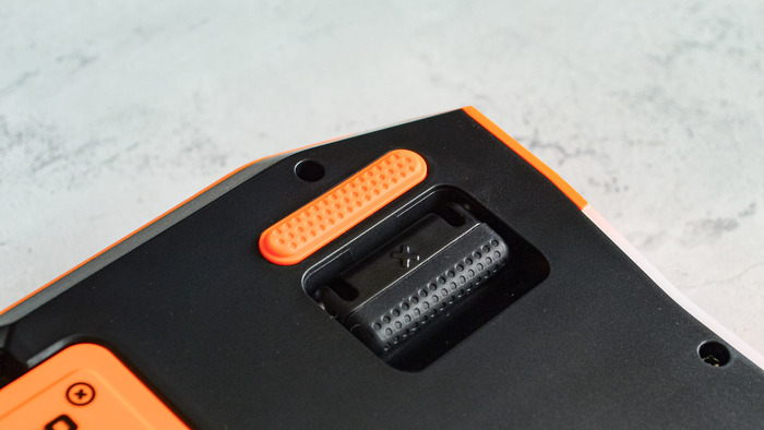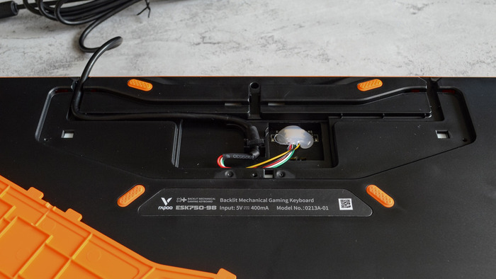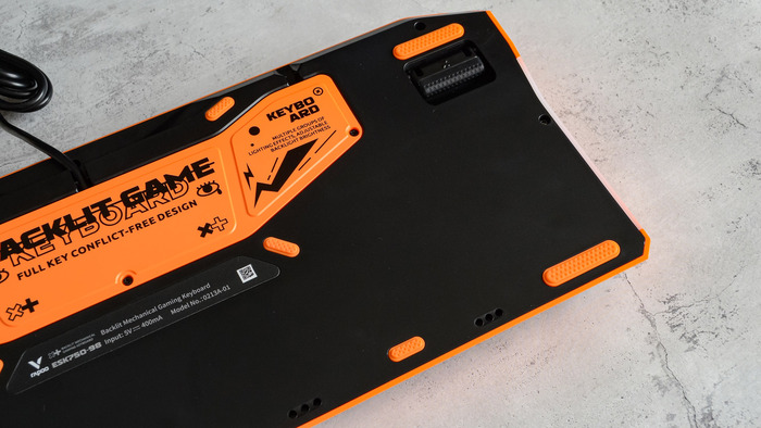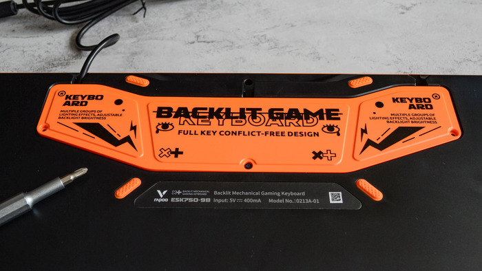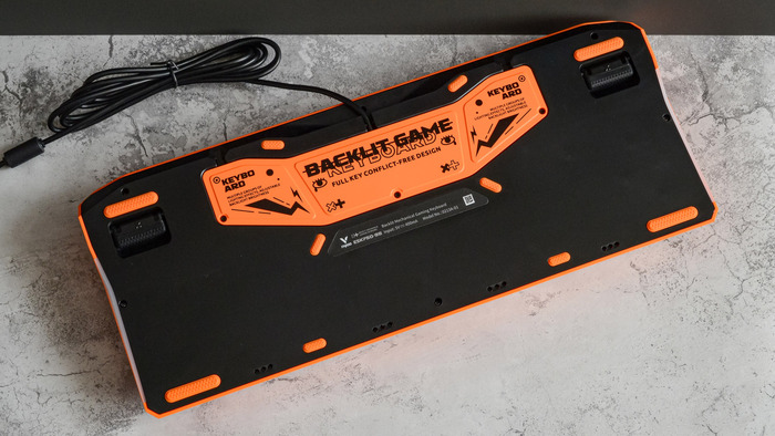 Нижняя часть клавиатуры плоская. Первое что здесь бросается в глаза – крупный съемный отсек оранжевого цвета, который щедро украшен надписями и стикерами (если можно так выразится).